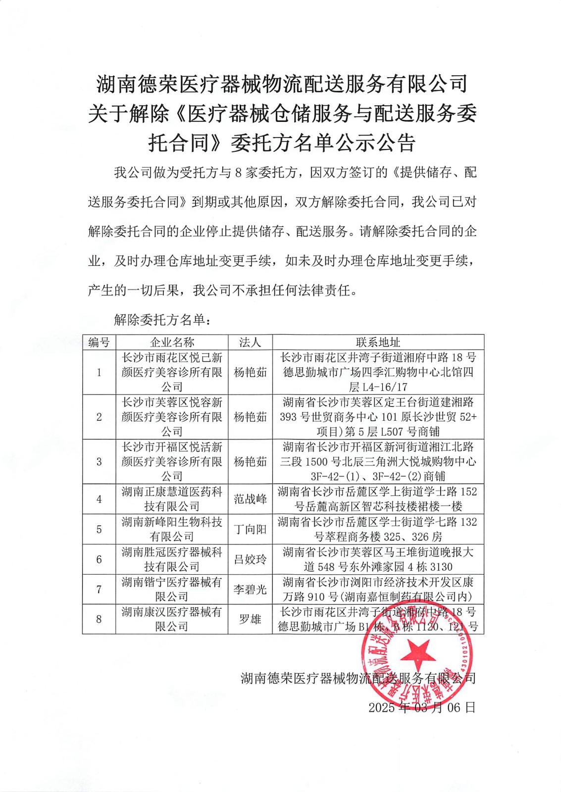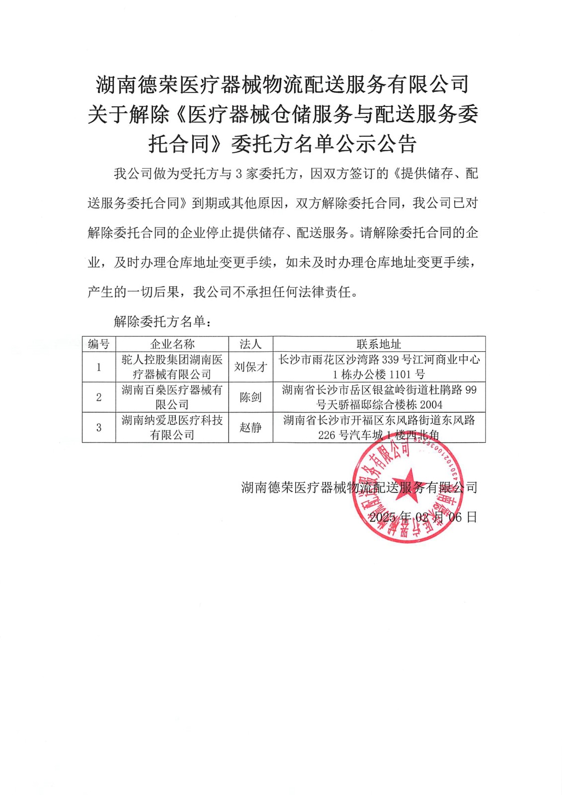 關(guān)于解除《醫(yī)療器械倉儲服務(wù)與配送服務(wù)委托合同》委托方名單公示公告