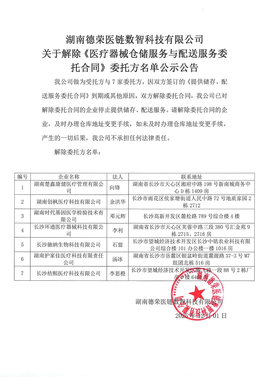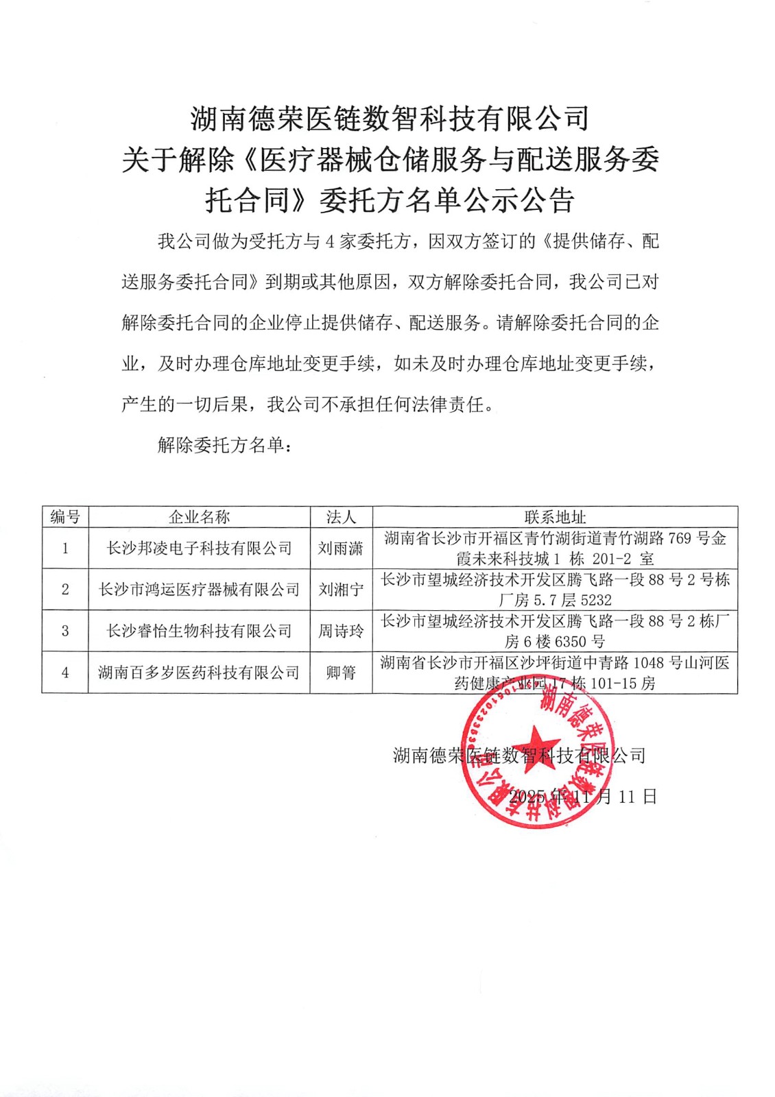 關(guān)于解除《醫(yī)療器械倉儲服務(wù)與配送服務(wù)委托合同》委托方名單公示公告